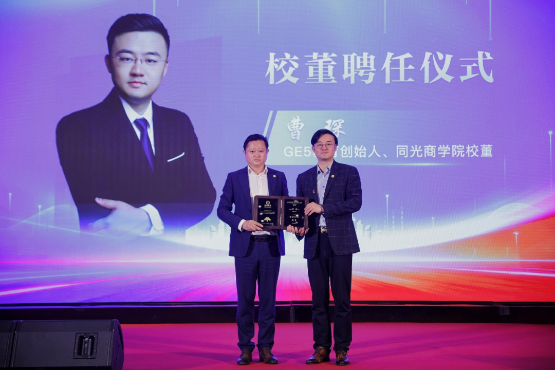 校董们作为同光商学院的重要支柱,为学院的建设与发展倾注了无数心血与智慧。GE5教育创始人曹琛博士登台接受校董荣誉授牌!同光商学院徐宗应校长为曹琛博士颁发聘任证书。