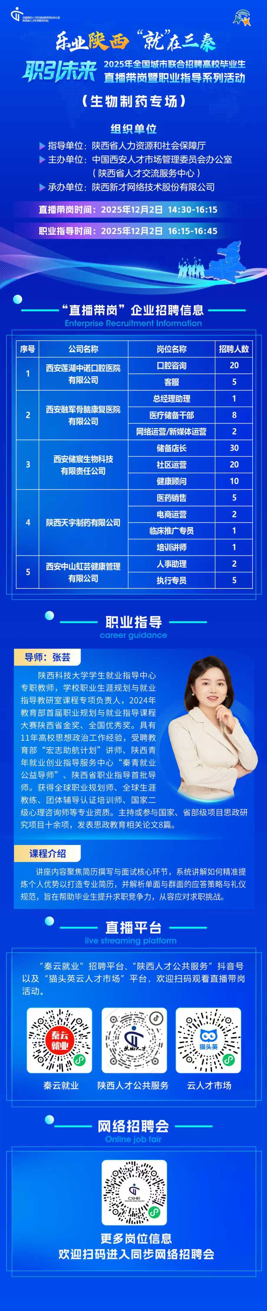 “乐业陕西‘就’在三秦”12月2日直播带岗暨职业指导系列活动(生物制药专场),邀您来参加
