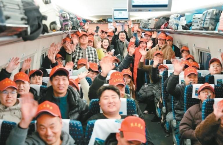 2月24日,在从西安北站出发的G1922次列车上,来自西安市周至县的务工人员在车厢内合影。