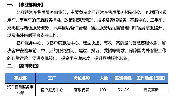 比亚迪客户服务中心招聘公告
