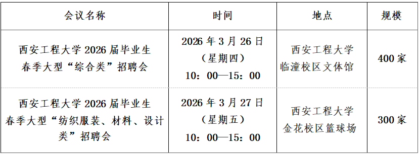 为更好的为各地人社机构、用人单位和校友单位选聘我校优秀毕业生,汇聚校企合力服务,更好地为毕业生和用人单位搭建双向选择平台,推动2026届毕业生更加充分更高质量就业。我校将于2026年3月26日举办西安工程大学2026届毕业生春季大型“综合类”招聘会,2026年3月27日举办西安工程大学2026届毕业生春季大型“纺织服装、材料、设计类”招聘会。诚挚邀请广大用人单位积极报名参加。相关事项如下:
