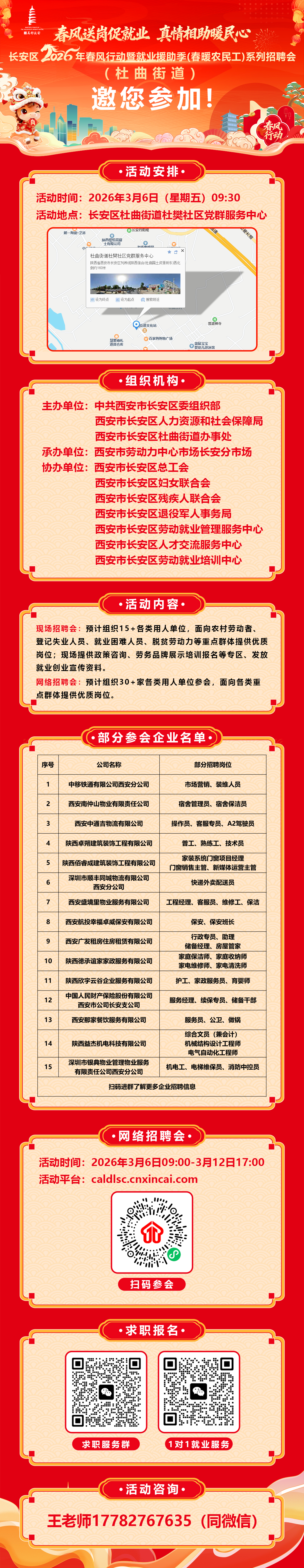 职”等你来丨3月6日9:30,长安区春风行动,20+企业千余岗位走进杜曲街道