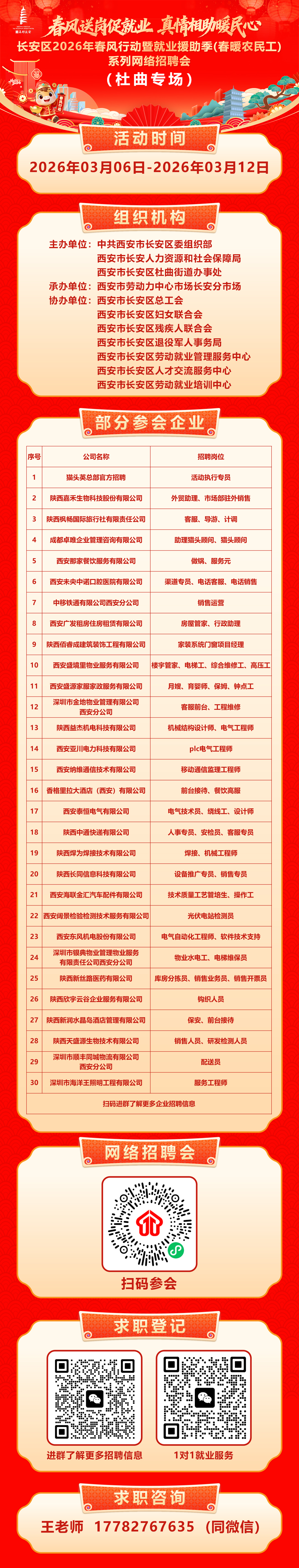 长安区2026年春风行动暨就业援助季(春暖农民工)系列网络招聘会(杜曲专场)