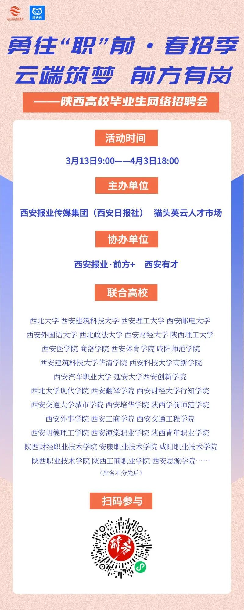 春招季来临,为了给高校毕业生提供更多就业选择,同时助力企业解决用人需求,西安报业传媒集团(西安日报社)联合知名人力资源机构猫头英云人才市场,将于3月中旬推出“勇往‘职’前·春招季云端筑梦前方有岗——陕西省高校毕业生网络招聘会”。