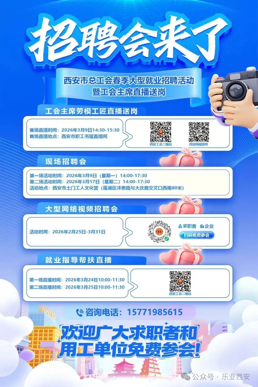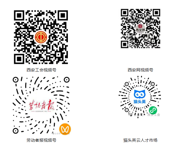 您还可登录“职工之家”APP进入“就业服务”,点击直播招聘观看直播;搜索“西安指尖工会”微信小程序或扫描二维码,关注“西安工会”、“劳动者报”微信公众号和视频号,“西安职工汇”抖音号、今日头条号、微博号,或登陆“西安工会网”(www.xagh.net)可观看直播。关注古都先锋微信视频号、西安网视频号、猫头英云人才市场平台可观看直播。