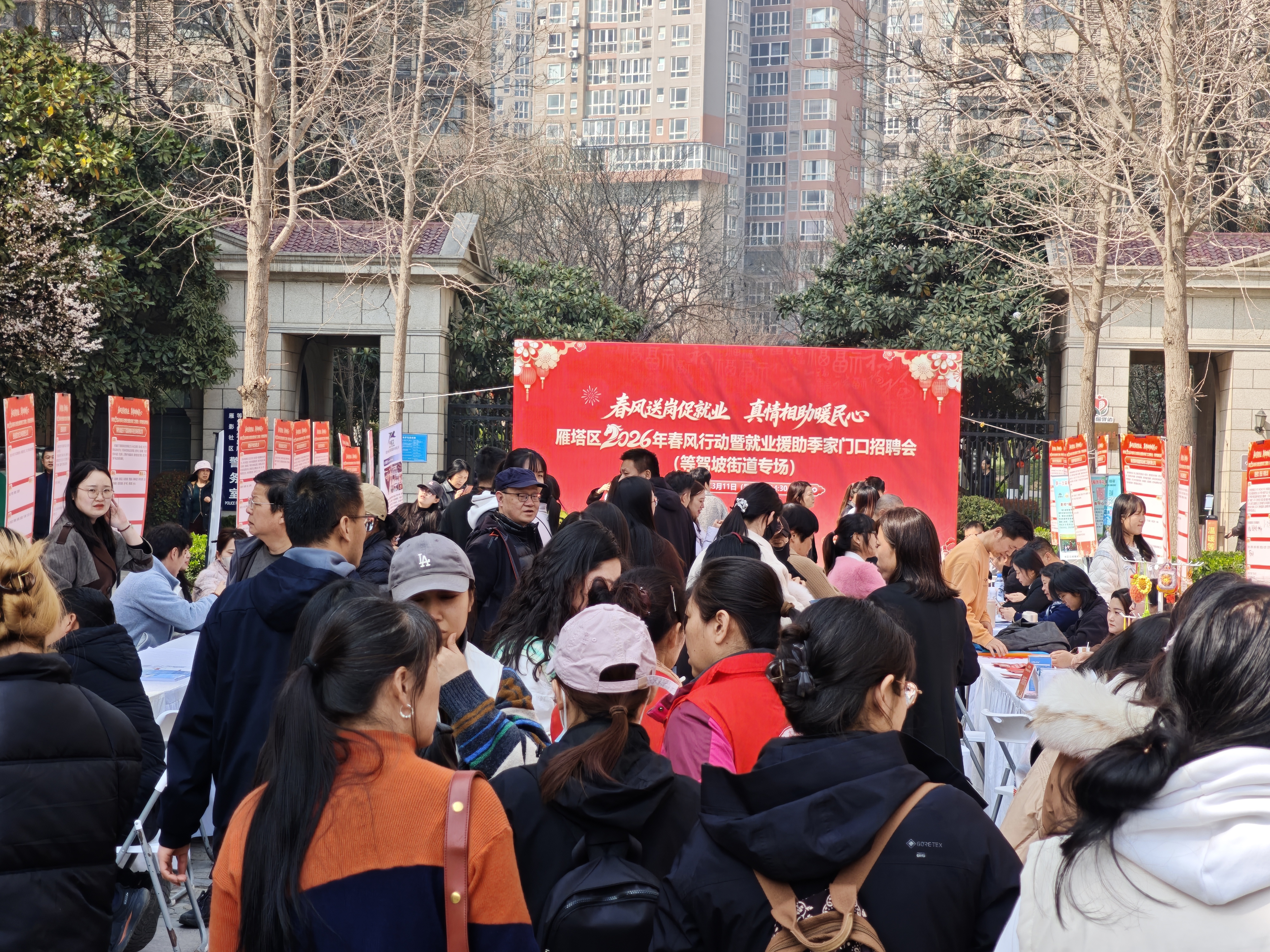 3月11日下午,雁塔区2026年春风行动暨就业援助季家门口招聘会(等驾坡街道专场)在西影路金业缇香山南门举行。本次活动由西安市雁塔区人力资源和社会保障局、西安市雁塔区等驾坡街道办事处共同,旨在将就业服务送到居民家门口,方便辖区求职者就近对接岗位。