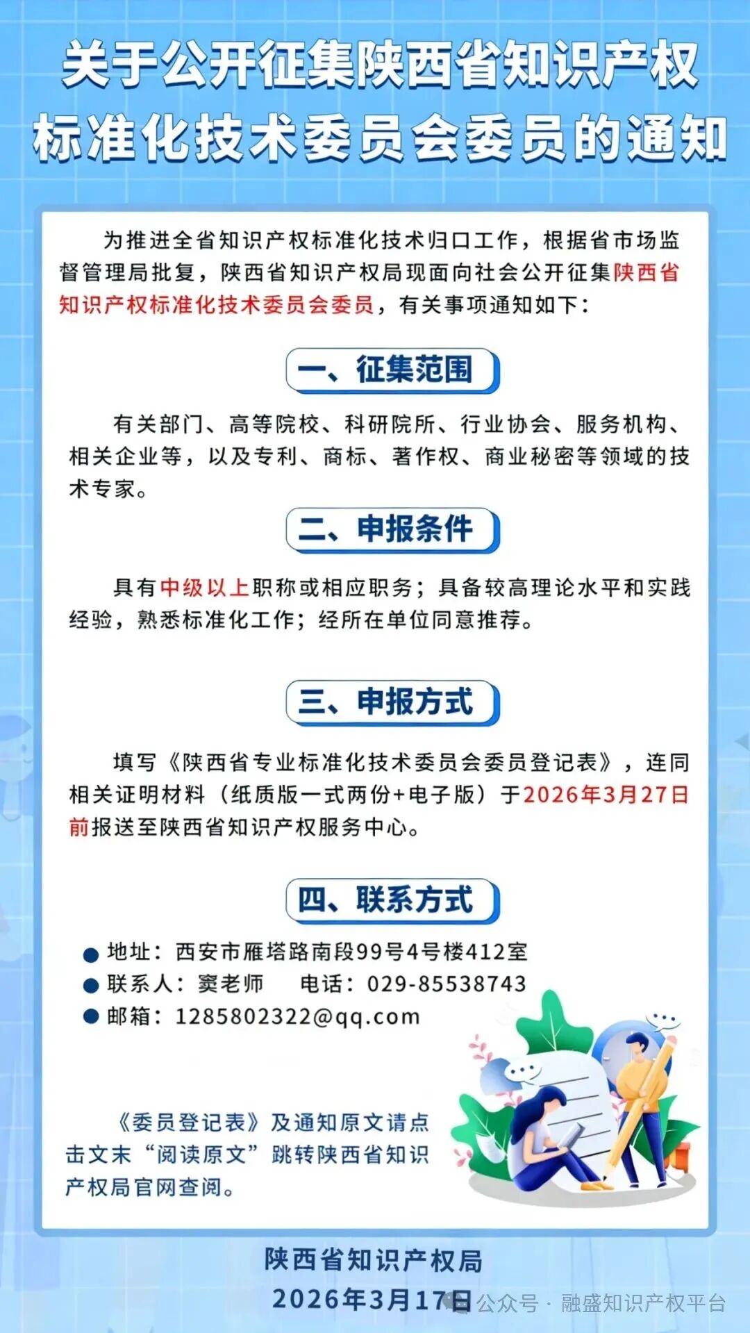 根据《陕西省市场监督管理局关于同意筹建陕西省知识产权标准化技术委员会的批复》(陕市监复〔2026〕30号),陕西省知识产权局负责组织筹建陕西省知识产权标准化技术委员会,负责全省知识产权标准化技术归口工作。为确保组建工作公平、公开、公正,按照筹建工作要求,现面向社会公开征集知识产权标准化技术委员会委员,具体事项函告如下: