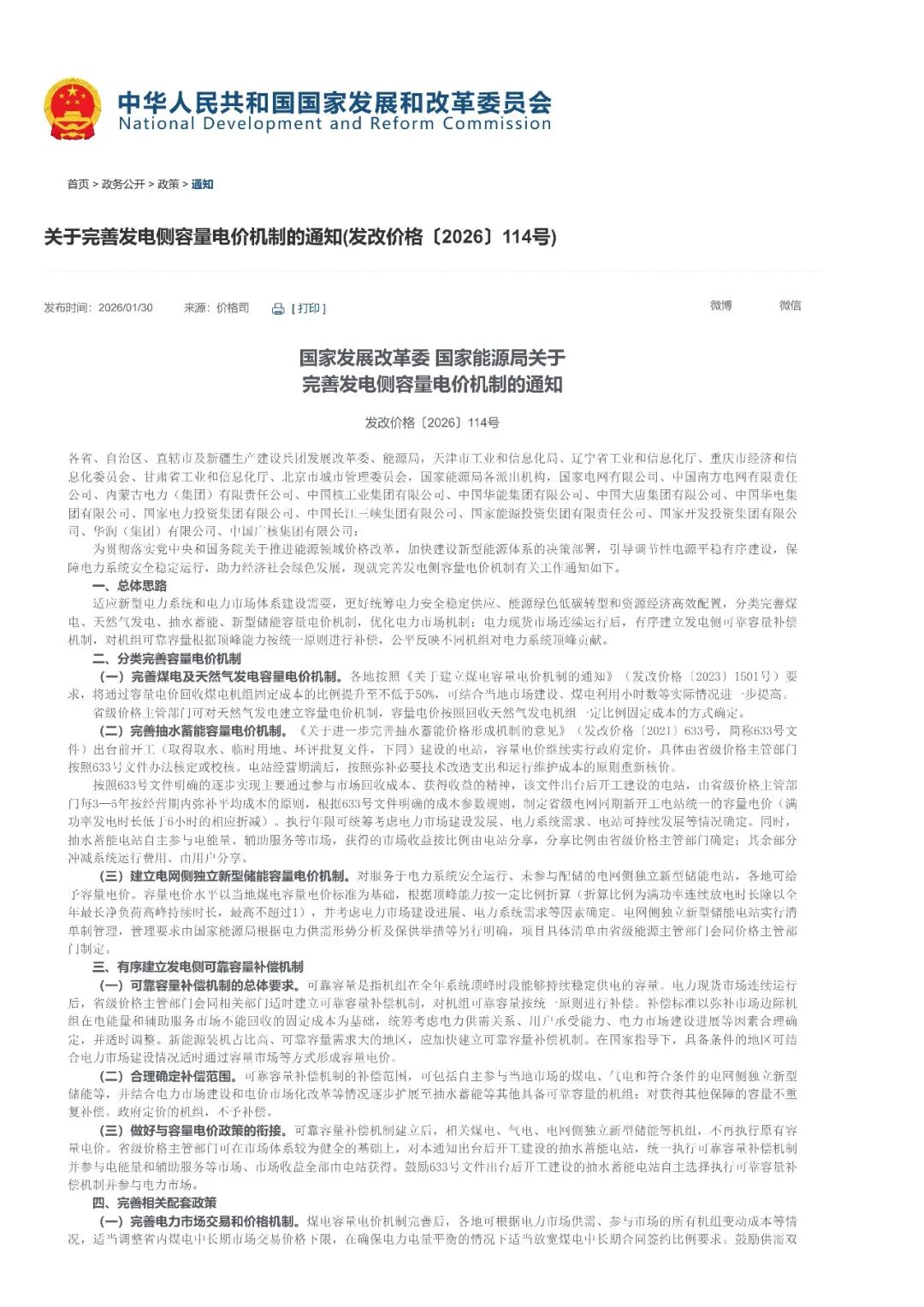 2026年1月28日,国家发展改革委、国家能源局《关于完善发电侧容量电价机制的通知》发改价格[2026]114号。
