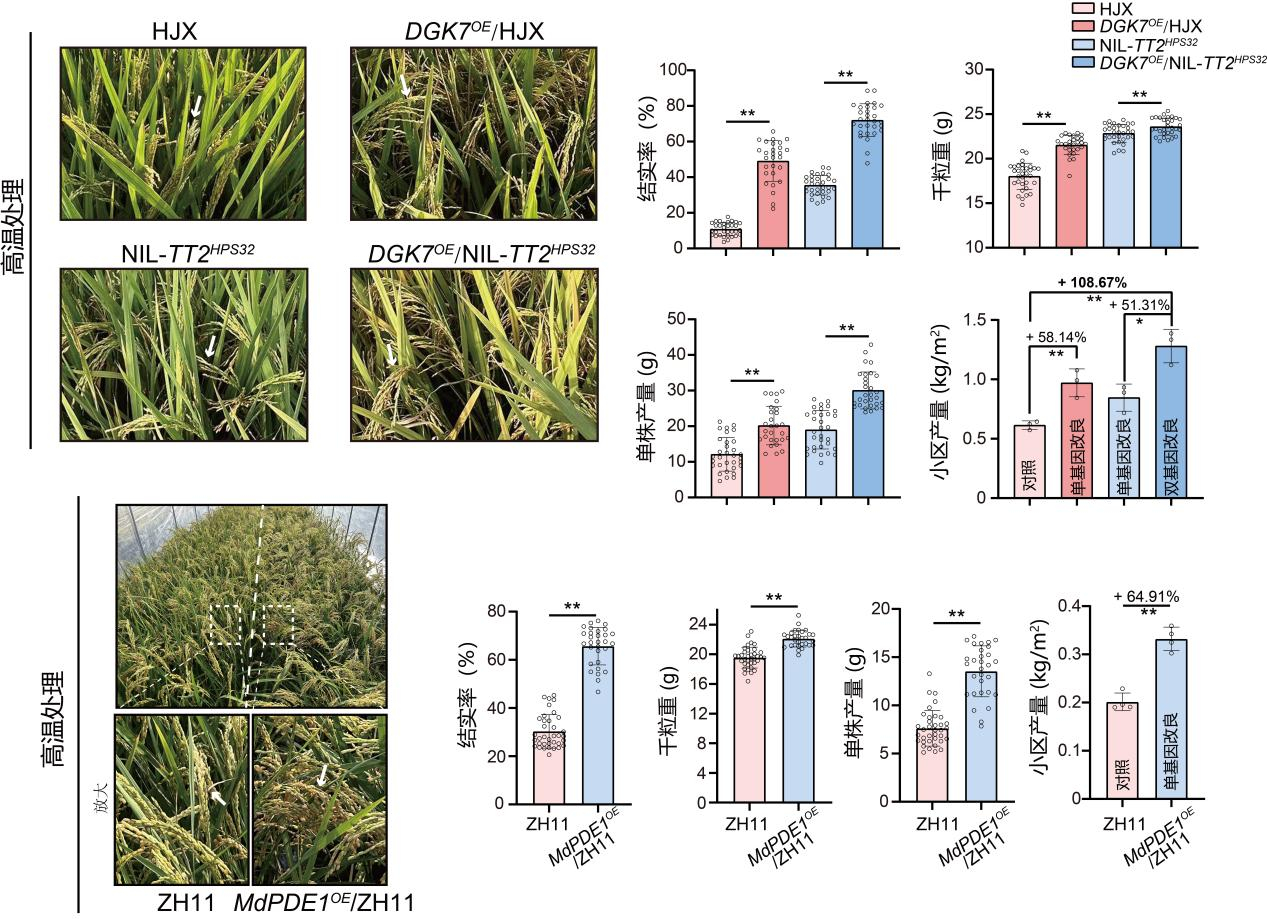 该机制的破解为育种提供了精准靶点。在高温下,单基因改良的株系比对照增产50%~60%;双基因改良的株系比对照增产提高约一倍,且不影响正常条件下的产量。科学家不仅能改良作物的耐热性,更能像调节音量一样精准设计“梯度耐热”品种,以适应不同地区的气候需求,为其他主粮作物的耐热育种改良提供扎实的理论依据与宝贵的基因资源。