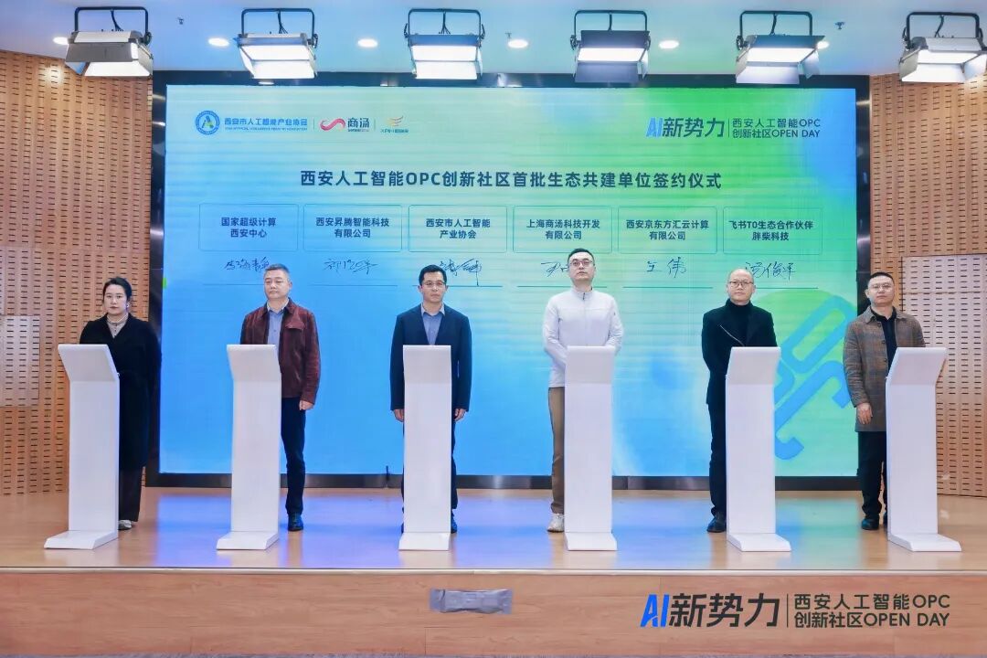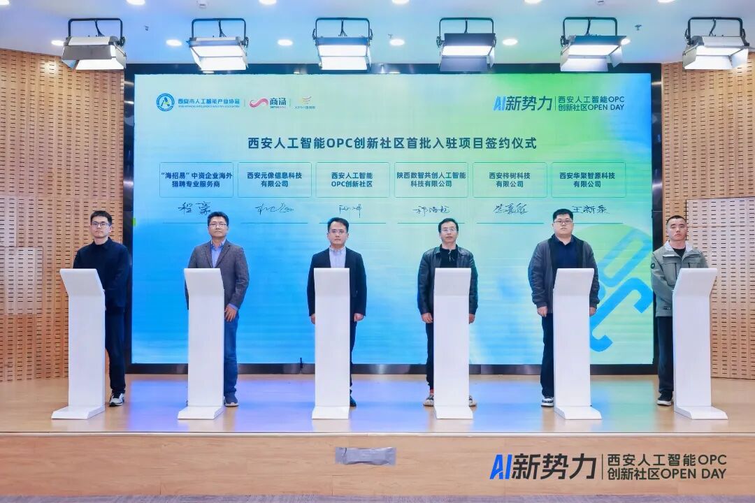 现场还同步举行西安人工智能OPC创新社区首批生态共建单位签约与首批入驻项目签约,多家机构、优质创业项目与社区达成合作,正式加入社区生态,标志着西安人工智能OPC创新社区全面启动运营服务,将为OPC创业者提供更完善的资源对接与协作支持。