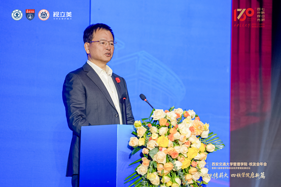 校友代表山东电工电力集团有限公司党委书记、董事长赵启在发言中回顾了在西安交大管理学院的求学时光,感谢母校“精勤求学、敦笃励志、果毅力行、忠恕任事”的校训精神对个人职业发展的深远影响。他表示,作为交大人,将始终铭记母校培育之恩,持续关注支持母校和学院发展,在产学研协同、人才输送、科研转化等方面深化合作,以实际行动为母校130周年校庆献礼。