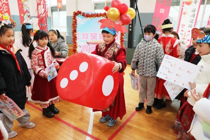 不远处的数学区更是热闹:“三七二十一!”“五八四十!”掷骰子背口诀的声音此起彼伏。最引人注目的是操场上的“马到成功”挑战,四五个孩子手拉手组成“小马驹运输队”,小心翼翼传递小球。这场融合传统文化与学科素养的“灵驹集五福”游园会,让评价在奔跑与吟诵中自然发生。