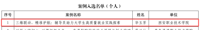 近日,高校毕业生就业协会公布2025届毕业生就业工作典型案例入选名单,西安职业技术学院建筑与轨道交通学院毕玉芳、王远东,学前师范学院李佳蔚3名教师凭借扎实成效与实践成功入选个人典型案例,充分彰显了西安职业技术学院在毕业生高质量就业工作中的实践成效与示范作用,获官方权威认可!