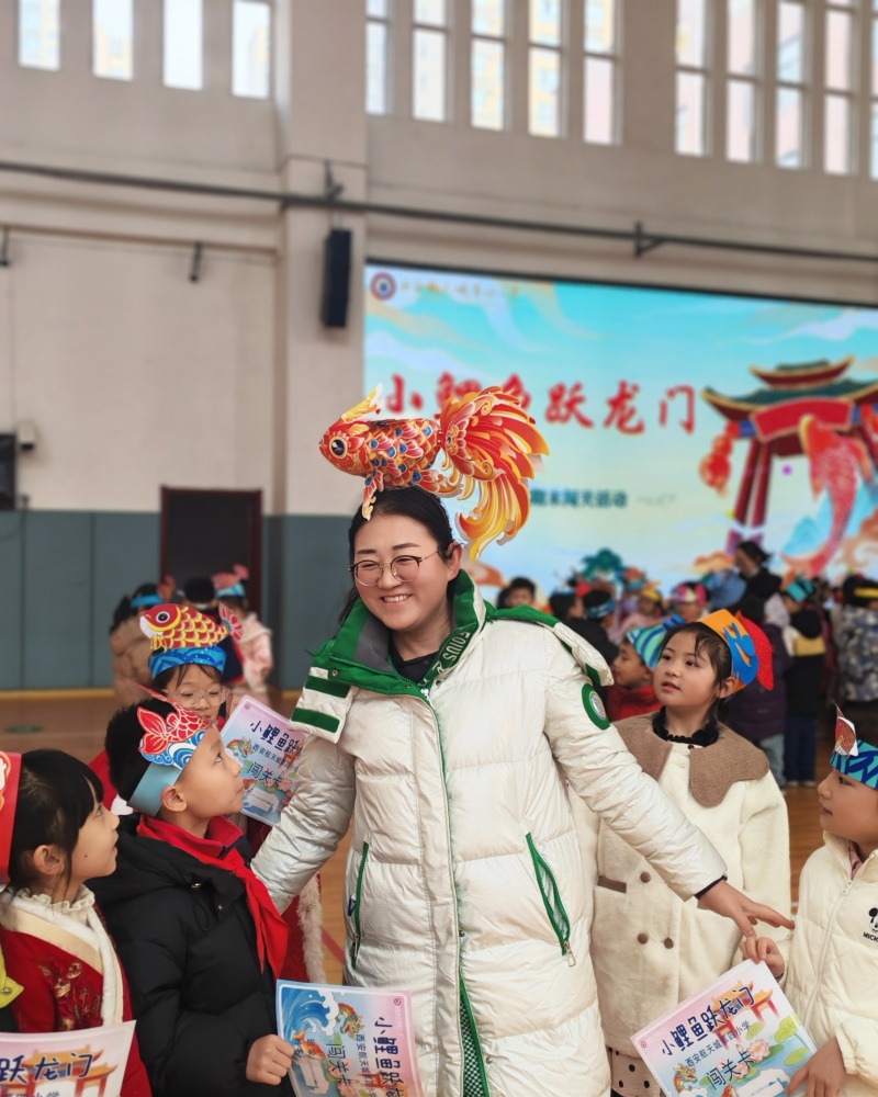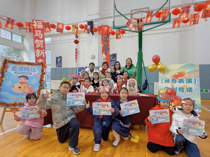 二年级“小鲤鱼跃龙门”主题活动中,语文关卡里孩子们抽多音字卡朗读、摇骰子造句、捞连环画讲故事。数学区化身“龙宫测量员”,测量物体、解金鱼形应用题,并在平板电脑上参与“数字鱼群”益智游戏。英语区笑声不断,“你划我猜”和转盘读词让语言鲜活起来。