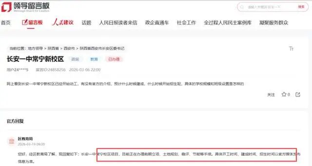 近日,有网友在人民网留言板留言咨询长安一中常宁校区建设问题: