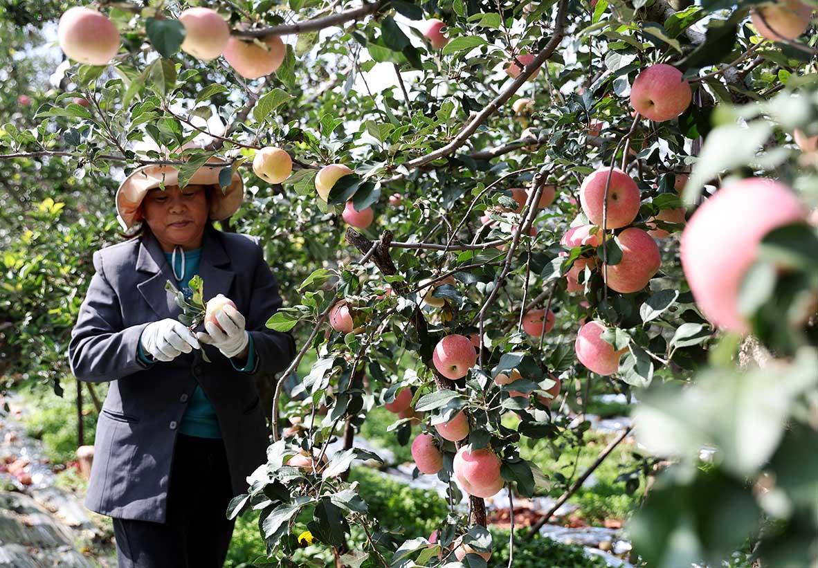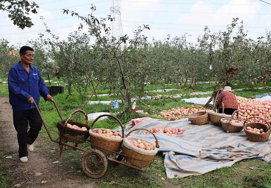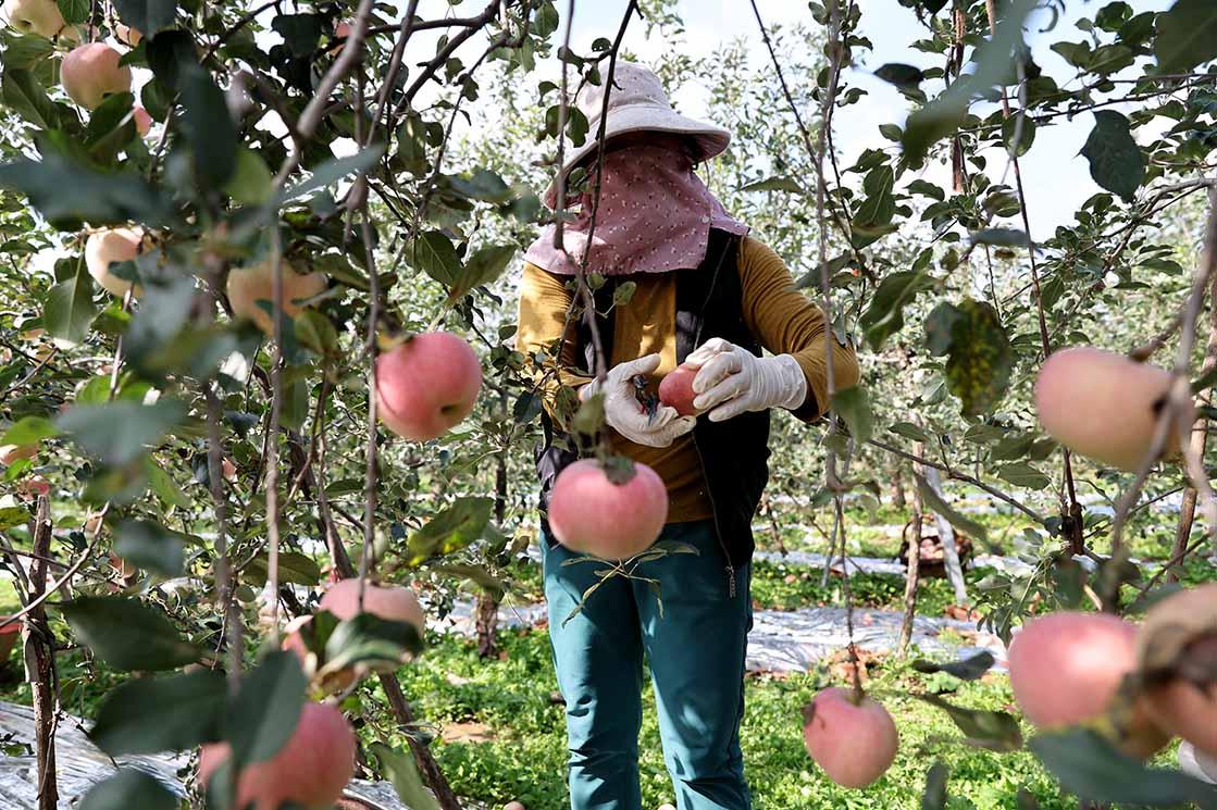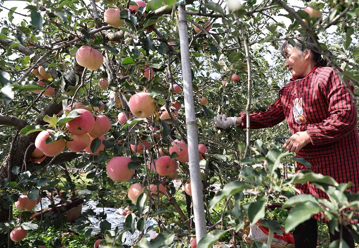 果园里,红彤彤的苹果挂满枝头,与果农们忙碌的身影相映成趣,大家穿梭在果树间,小心翼翼地将果实摘下、装筐,一派丰收的热闹景象,构成了秋日里一幅动人的丰收画卷。