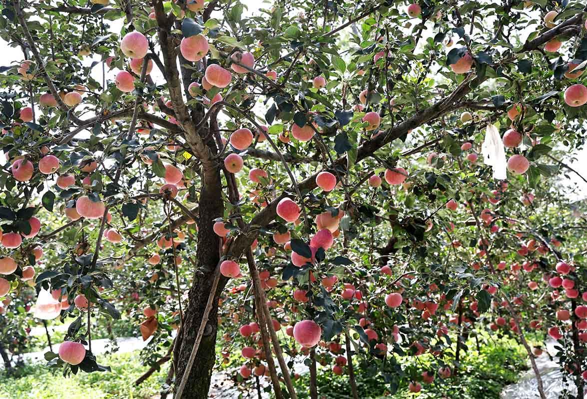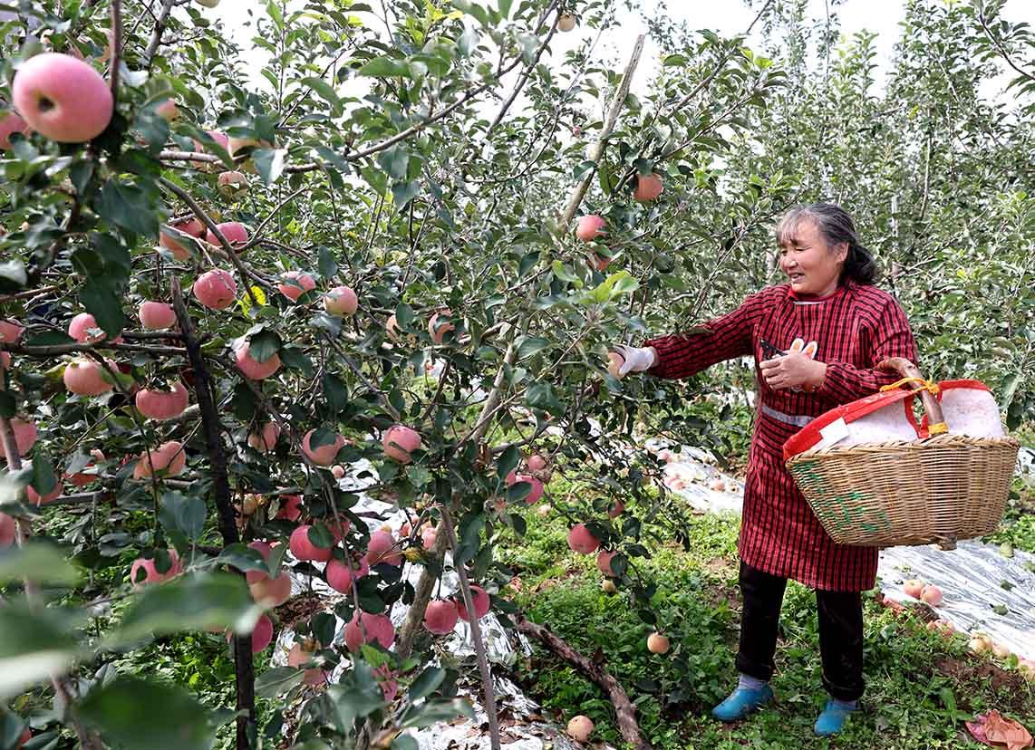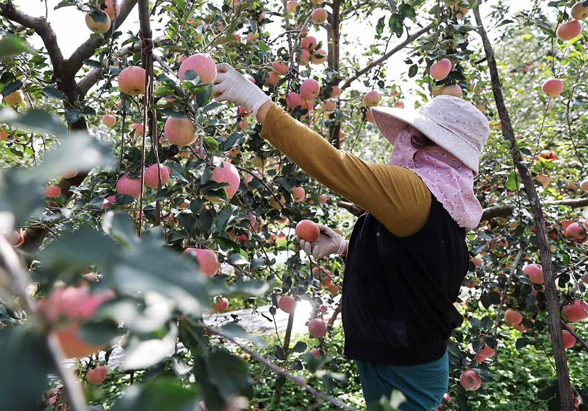 果园里,红彤彤的苹果挂满枝头,与果农们忙碌的身影相映成趣,大家穿梭在果树间,小心翼翼地将果实摘下、装筐,一派丰收的热闹景象,构成了秋日里一幅动人的丰收画卷。