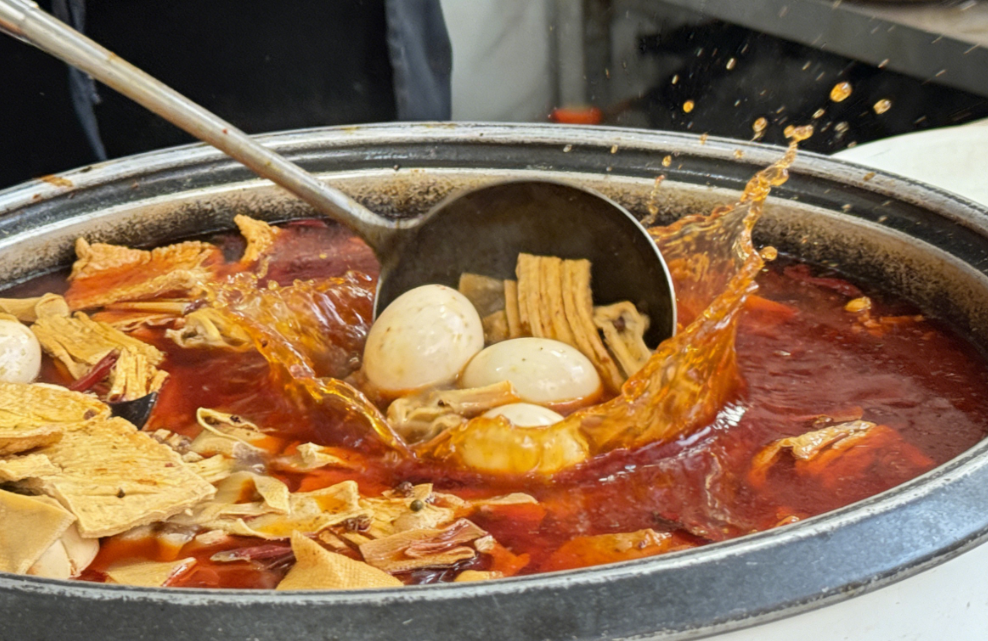 “鸡蛋花干夹馍”的精髓则在于其中的花干。汇集了数十种香料的卤汁,经过长期慢炖后香气愈发醇厚深沉,花干如海绵般在其中吸饱汤水,每一个孔洞都充盈着浓郁的汁液,卤香同时深入鸡蛋,蛋白在长时间的炖煮中染上酱色的纹理,带来绵密咸香的口感。这款夹馍是“老西安人”日常生活中的一份踏实与满足,它以一种温润的方式,让素食不输肉的丰腴与醇香。