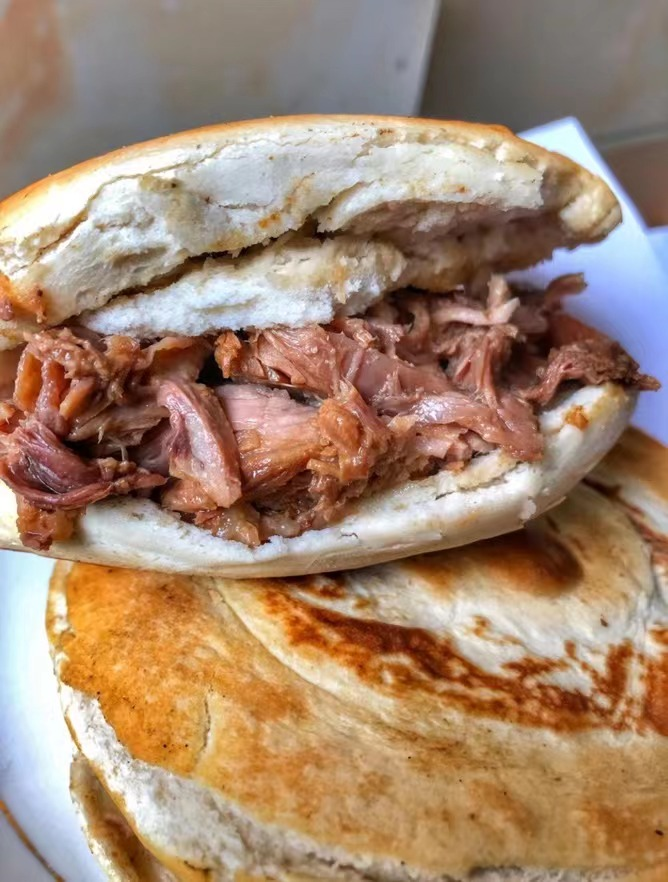 若论西安夹馍界的“顶流选手”,当属“腊汁肉夹馍”。精选猪肉在陈年老汤中文火慢炖数小时,直至肉质酥烂,肥而不腻,瘦而不柴。趁热夹入外脆内软、形似“虎背菊花心”的白吉馍中。一口咬下,浓郁的肉香与醇厚的卤汁瞬间充盈口腔,回味无穷。