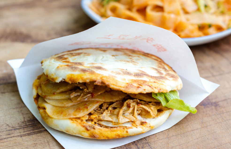 西安市高陵区的特产“土豆片夹馍”,将新鲜土豆切成薄片,以竹签串起,在滚水中快速焯熟,再浸入秘制辣油中翻滚入味,最后夹入热乎的白吉馍。一口下去,麻辣鲜香,酥脆软糯。