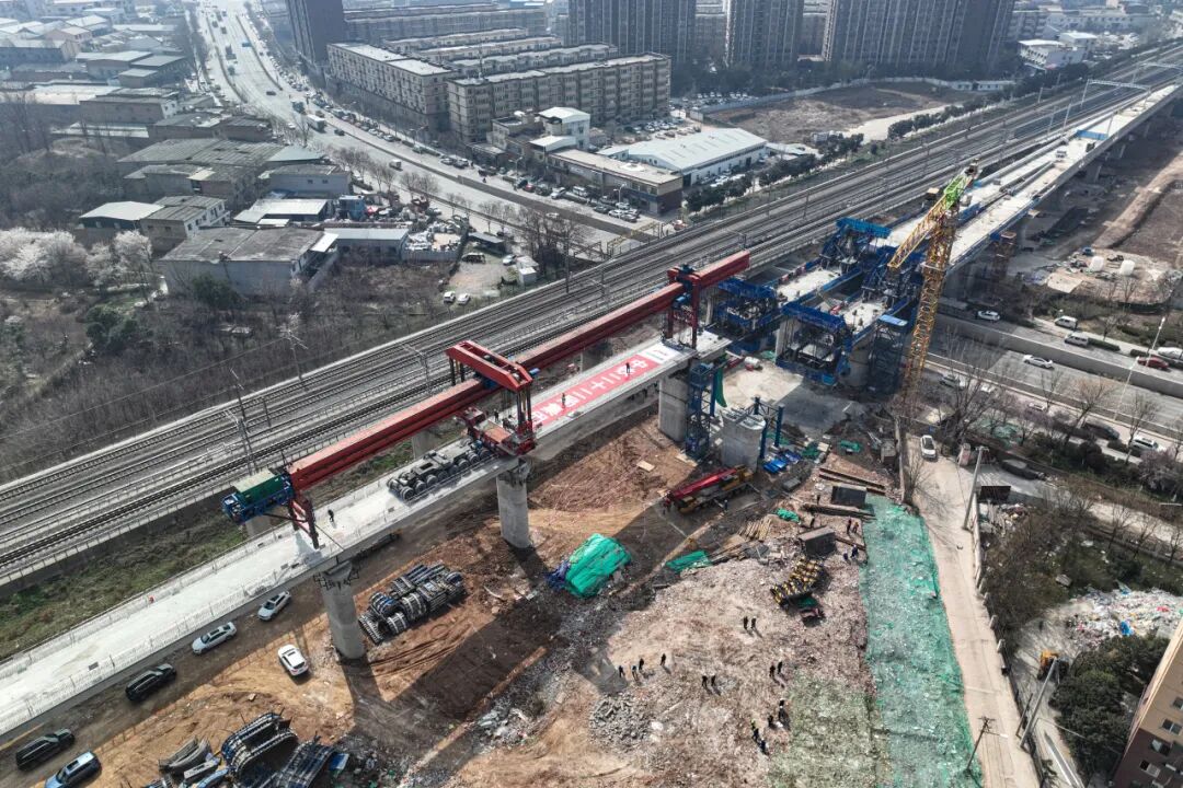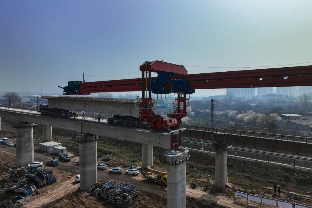 西安东站箱梁架设任务涵盖西十、西康正线及多条枢纽联络线,共需架设箱梁394孔。其中,站房南侧185孔,站房北侧209孔。面对最小曲线半径400米,最大纵坡30‰,7次上跨既有铁路等严峻挑战,项目团队开展合力攻坚,创新采用多设备协作模式,细化施工组织方案,全力确保箱梁架设任务圆满完成。