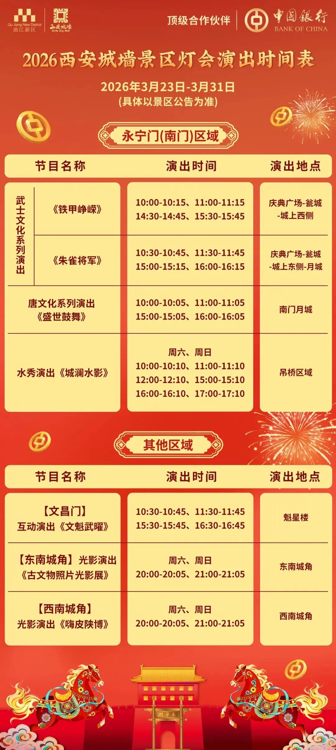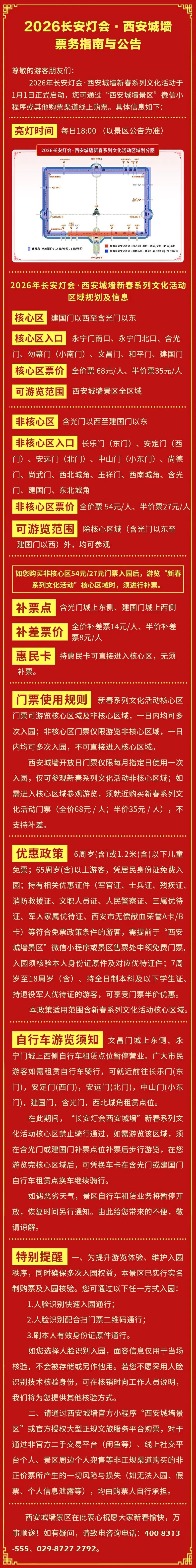 无论是想补一场新春的浪漫,还是赴一场春日的邂逅,现在都是最好的时机。不必再为票价犹豫,不必再错过这份美好,趁着春光正好、灯火正盛,约上家人朋友,在千年城垣之上,在璀璨灯火之间,定格属于长安的春日记忆,让这份千年古都的浪漫,成为这个春天最难忘的回忆。