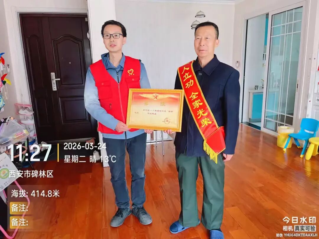 3月24日,碑林区东关南街街道互助社区退役军人服务站工作人员专程上门,为荣获“四有”荣誉的退役军人家庭送上喜报,将党和政府的关怀与尊崇精准传递、送到群众心坎深处。
