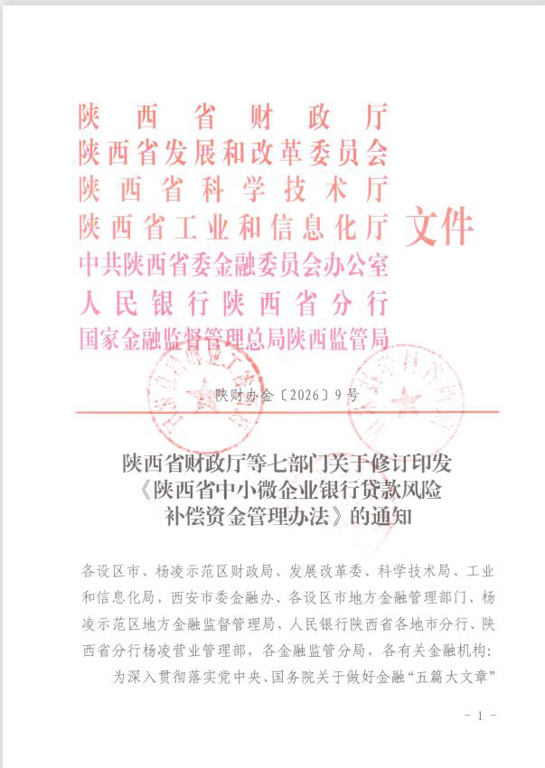3月20日,陕西省财政厅联合省发改委、省科技厅、省工信厅、省委金融办、人民银行陕西省分行、陕西证监局等七部门,正式修订印发《陕西省中小微企业银行贷款风险补偿资金管理办法》(下文简称《办法》)。此次修订在原“1+N”风险补偿体系基础上,加入“省市联动机制”,进一步优化政策供给,旨在通过财政资金与金融政策的深度融合,引导更多信贷资源精准投向中小微企业及重点领域,助力全省经济高质量发展。