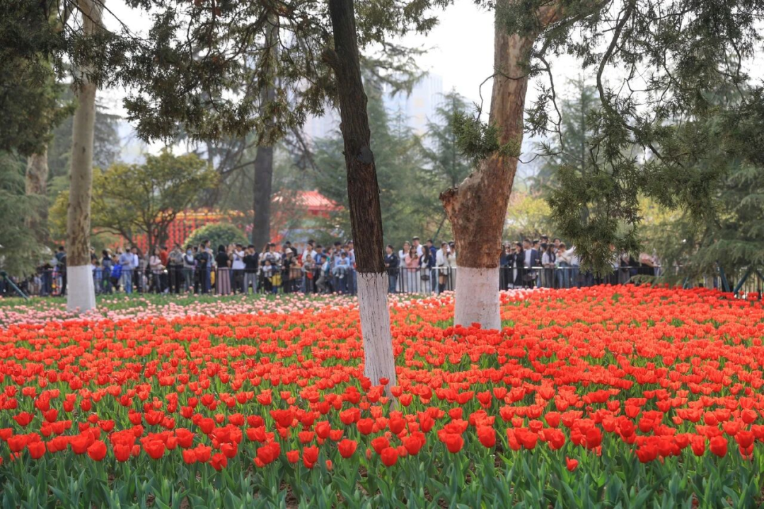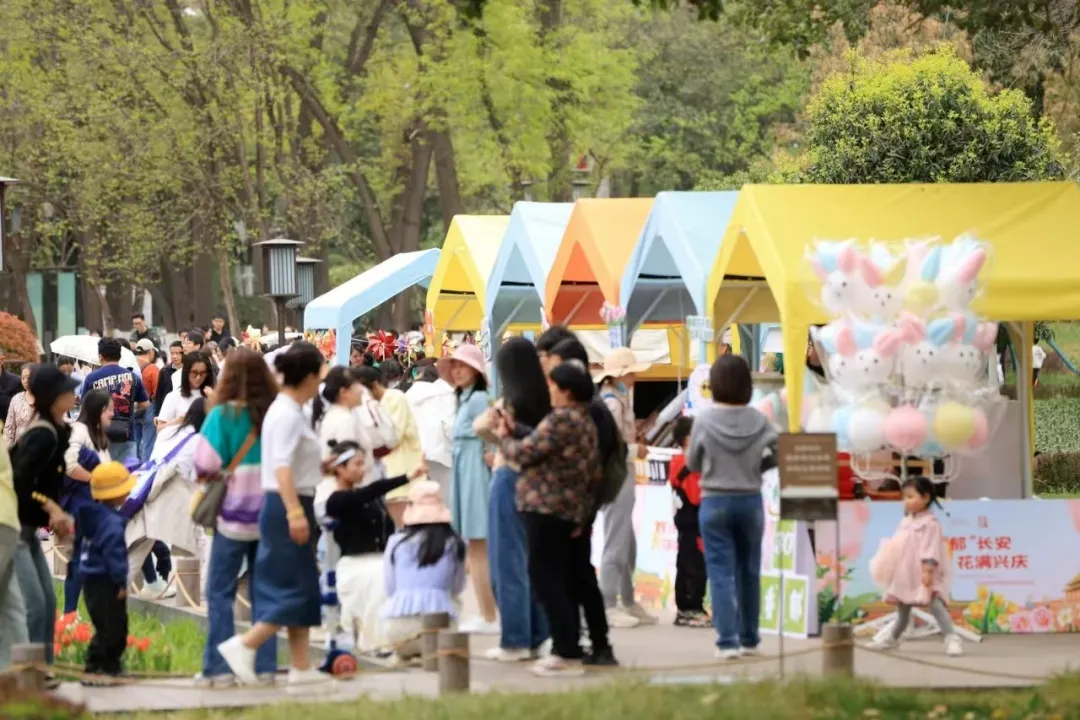 花展期间,游客们可在西南角遗址区体验春日露营,幕天席地,群花相伴;在南门、沉香亭、西南角花海区域逛春日市集,购买特色美食、精美文创;在码头乘船游湖,感受春日的松弛与惬意。