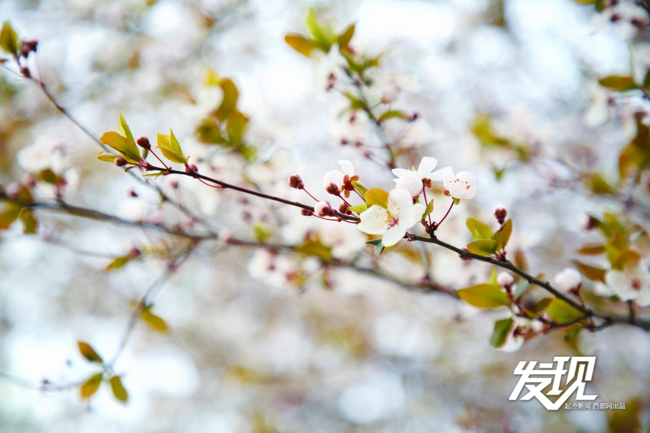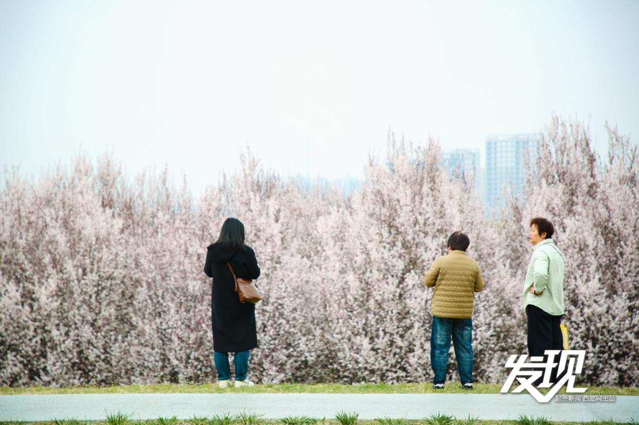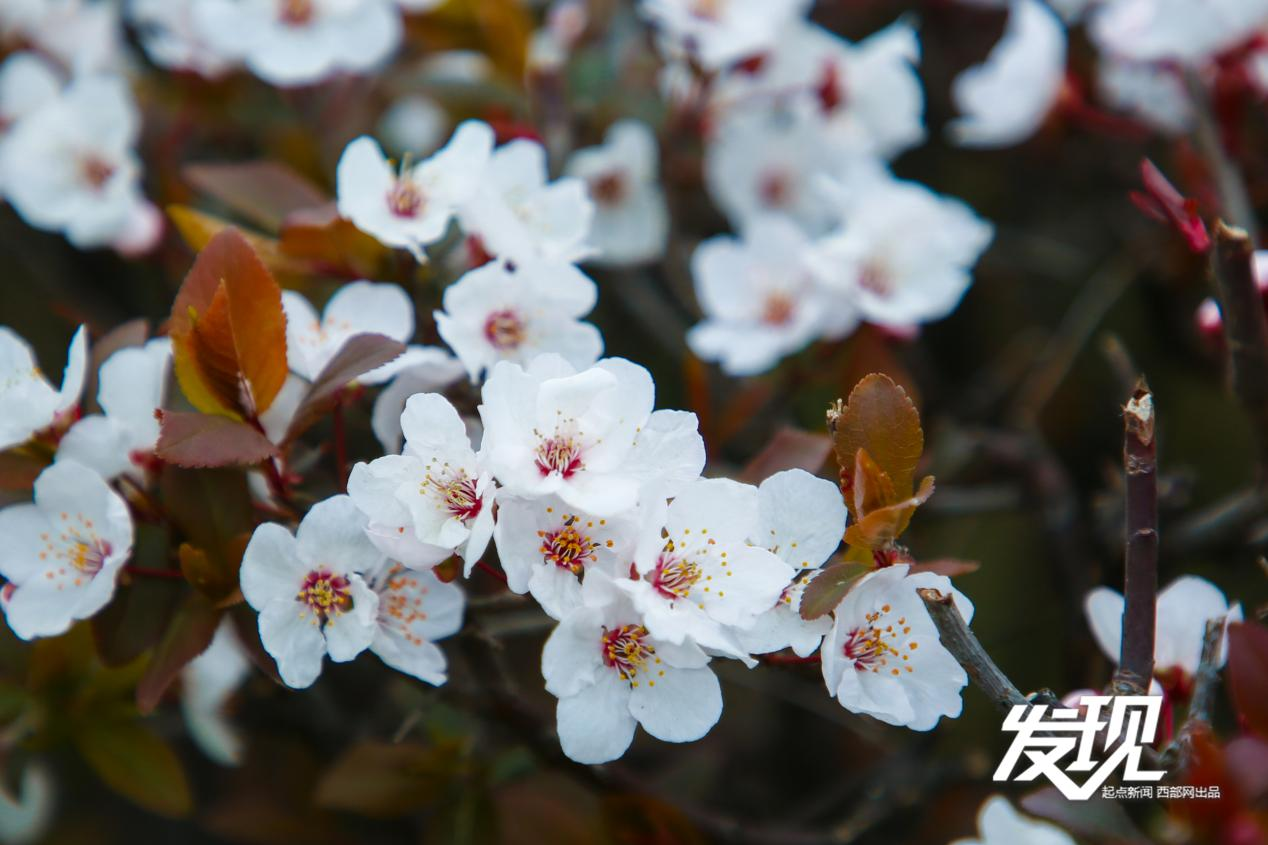 紫红色的叶丛托着素白花瓣,与渭河风光、城市脉络相映成趣,既藏着城市绿化的细腻匠心,也透着西安春日最质朴的美好。