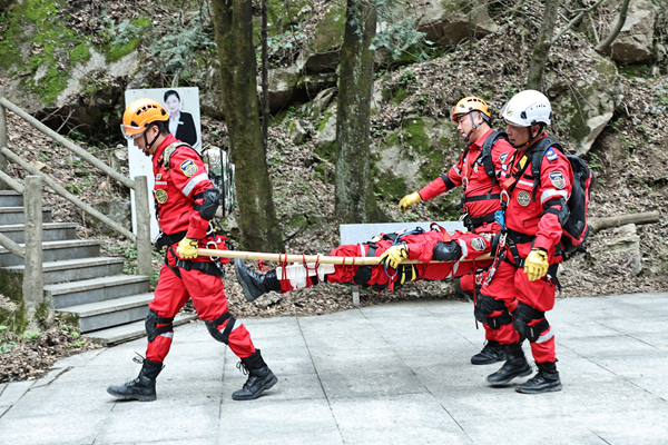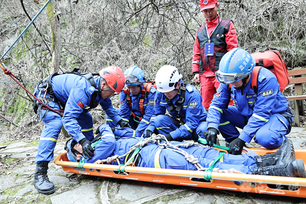 比武现场紧张激烈,各参赛队伍闻令而动、协同作战,充分展现出过硬的专业素养和良好的战斗作风。绳索技能环节,队员们凭借精湛技艺完成横渡、崖降等高难度动作;目标搜寻中,队员结合地形灵活运用搜索技巧,精准锁定目标位置;担架搬运时,大家兼顾速度与安全,高效完成伤员转移;应急救护环节,队员沉着冷静、操作规范,熟练处置各类模拟伤情,将专业救援技能展现得淋漓尽致。
