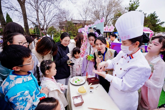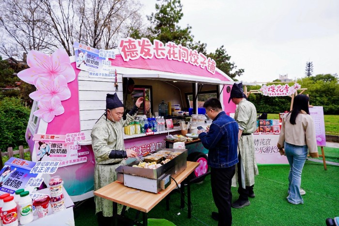 值得一提的是,西安城市观光车“博物馆号”首次进驻景区。这辆以文物为主题的城市观光车,内部不仅设有文物复原展览,游客还可以盖章打卡,成为樱花季一道独特风景线。“我们希望通过这一流动的文化空间,让游客在赏花之余更深入地了解文物背后的故事,并将整个城市的文旅资源串联起来。”西安旅游集团文化产业投资有限公司副总经理秦旭表示。本次樱花季活动与西安饮食旗下多家中华老字号品牌进行联名合作,德发长、桃李村、五一饭店等品牌纷纷亮出绝活,将传统美食与樱花元素巧妙融合,打造“老字号能量补给站”。现场推出的樱花慕斯、樱花米酿、樱花茶饮等多款“樱花限定”产品,凭借高颜值与好口感,成为年轻游客争相打卡的“爆款”。