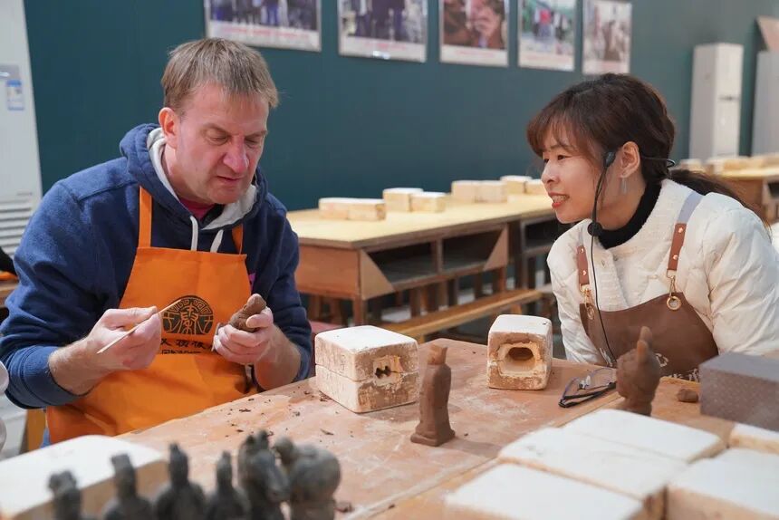在西安临潼非遗陶俑烧制技艺传习所体验陶俑制作