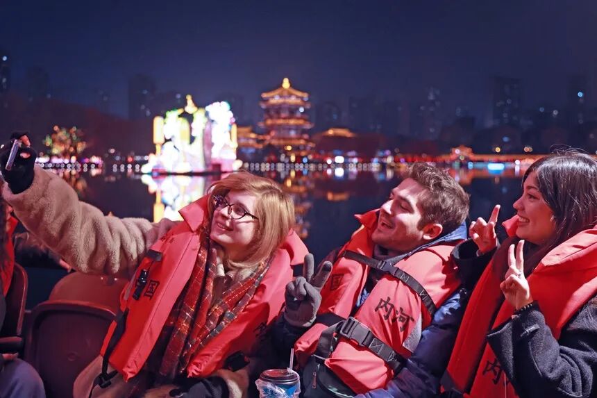2026年新春,外国游客在西安大唐芙蓉园坐船赏灯