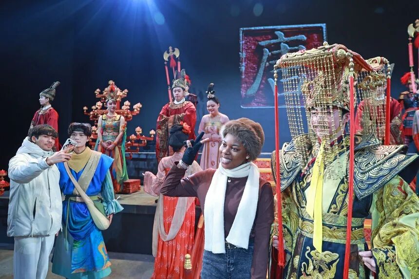观看情景舞剧《梦回大唐》后,游客与演员合影